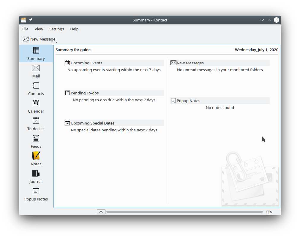 Kontact 是一个功能齐全的 PIM(个人信息管理)套件,将电子邮件、日历、新闻源、地址簿等功能整合在一个地方。每个 Kontact 组件(KMail、KOrganizer、Akregator 等)也可以作为独立应用程序使用。