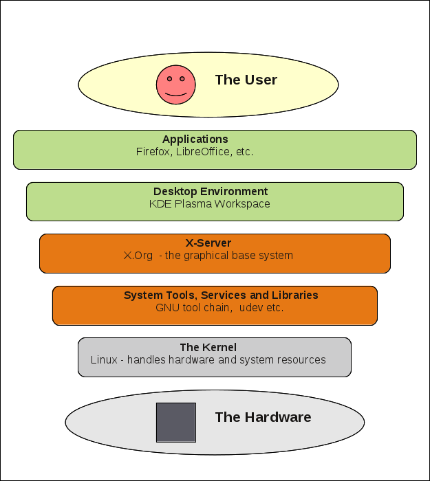 任何现代计算机操作系统都是一个非常庞大而复杂的产物——GNU/Linux 发行版也不例外。Linux 内核只是众多组件之一。下图显示了核心组件及其各自的作用。