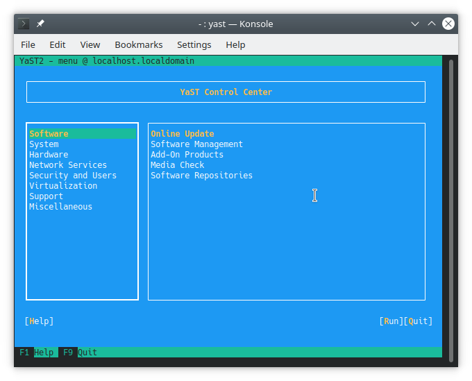 YaST 模块也可以在终端中使用(ncurses 模式)——这对于没有图形环境运行的服务器、通过 SSH 进行远程访问或在图形环境失败时非常有用。